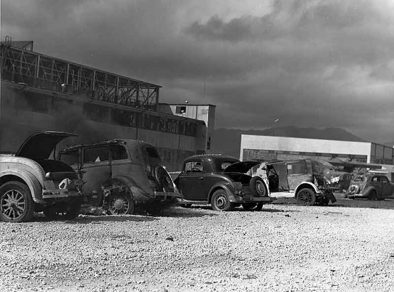 Burned out cars at Kaneohe Bay, December 7, 1941