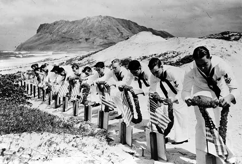 Seamen at Kaneohe Naval Air Station decorate the graves of their fellow sailors killed at Pearl Harbor, 1941
