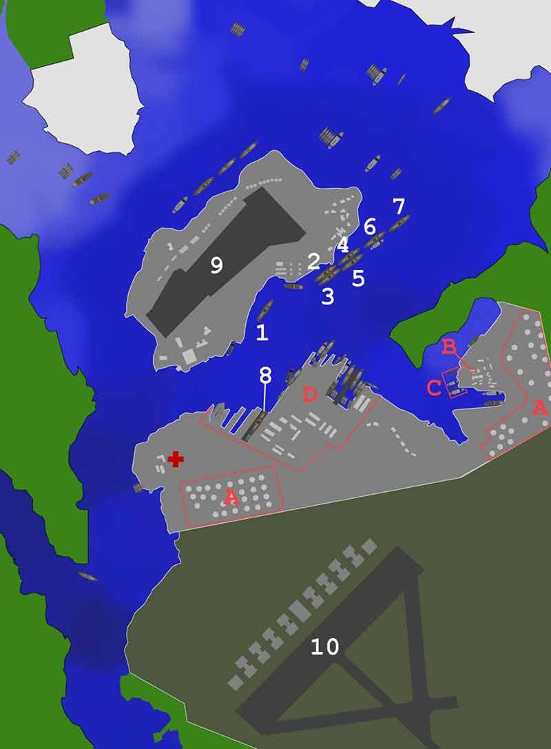 A map of the area on December 7, 1941, demonstrating what was hit and what was spared: Attacked targets: 1: USS California. 2: USS Maryland. 3: USS Oklahoma. 4: USS Tennessee. 5: USS West Virginia. 6: USS Arizona. 7: USS Nevada. 8: USS Pennsylvania. 9: Ford Island NAS. 10: Hickam field. | Ignored infrastructure targets: A: Oil storage tanks. B: CINCPAC headquarters building. C: Submarine base. D: Navy Yard.