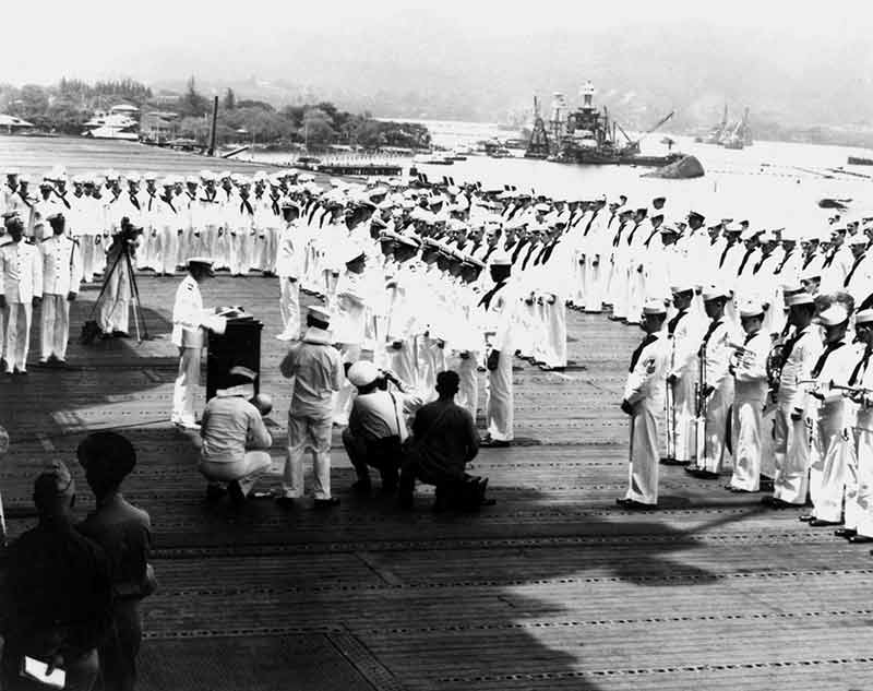 U.S. Navy Admiral Chester W. Nimitz presents awards on the flight deck of the aircraft carrier USS Enterprise at Pearl Harbor. The USS West Virginia is visible in the background with salvage work going on. The bottom of USS Oklahoma is visible in front of West Virginia, the main mast of USS Arizona is beyond her.