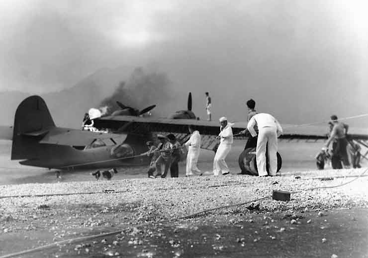 Sailors trying to save flying boat at Kaneohe Bay, December 7, 1941
